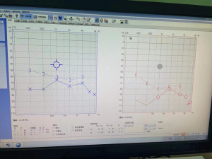 验配过程:接待黄老伯的时候,他耳朵上挂着两台模拟式的助听器,工作人员先帮黄老伯取下助听器做了抽湿和保养处理,期间帮黄老伯检查了耳道,耳膜完整,耳道情况基本正常,保养完助听器给黄老伯戴上,交流还是很困难,很多话需要重复多遍才基本明白。工作人员替黄老伯做了听力检测:听力图显示左耳呈重度混合性听损,右耳极重度混合性听损。
