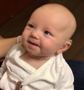 骨导助听器,顾名思义,通过颅骨的传导而进行声音放大后传递的一个助听设备。它像一个小的蓝牙耳机一样,我们通过头戴的方式固定在头部,声音通过助听器的麦克风收集,通过骨导式助听器,转化为振动能量,通过振动颅骨来听到声音。这样听到的声音,其实也是比较真实的,接近于正常的听力。对于双侧耳廓畸形,双侧没有外耳道发育的小朋友,收到的效果是非常好的。当然这样一个听力设备的干预,还是越早越好,我们建议在6个月以内。