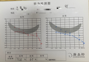 验配过程:王奶奶的孙女是从地图上搜索到我们易声体力服务中心,接待王奶奶的时候,王奶奶给人的感觉心态非常乐观积极的,和蔼且满面春风。工作人员先用电耳镜检查下外耳道,耳膜及耳道壁都正常。接下来给王奶奶做了纯音听力检查,双耳呈现感音神经性听力损失,左耳听力71.25dB、右耳听损平均值60dB。