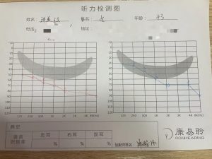 工作人员例行询问病史、检查耳道、纯音测听:无家族遗传史、无外伤史,但儿童时期因为经常发烧会频繁使用抗生素;纯音听力检查显示左耳平均听损61.25dB,右耳平均听损75dB,双耳呈渐降型的重度感音神经性听损。