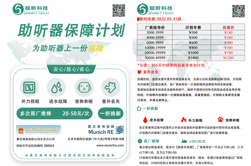 对于大多数家庭来说,助听器还是比较昂贵的,如果助听器因外力损毁、进水故障、宠物吞噬等原因造成设备故障,或者意外丢失,并非原厂保修和三包保障的范围,用户要支付高昂的维修或重置设备费用。易声助听器携手聪聆科技,推出助听器保障服务计划,可提供多次原厂维修、丢失一折换新服务,有效保障助听器意外事故和丢失。多一份保障,使用更安心。