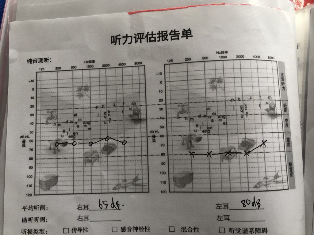 易声听力服务中心工作人员为老人做了全面的听力检查,老人左耳平均听力损失为80dB HL,右耳平均听力损失为65dB HL,属于重度听力损失。