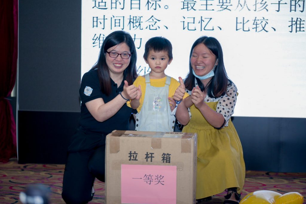 最后阶段,我们设置了抽奖环节,拉杆箱、电风扇、积木桌等精美奖品纷纷送到了参会家长的手中。