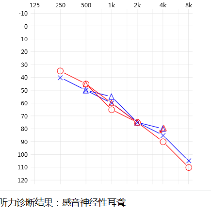 后来找到西安易声听力服务中心,声听力服务中心工作人员为刘女士做了全面的听力检查,纯音听阈检测听力呈陡降型,1K~8K平均听损在80dB左右,属于极重度听力损失。