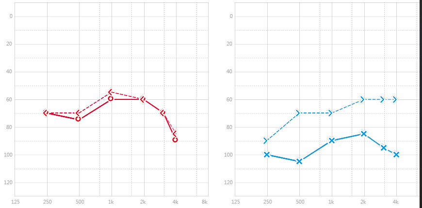 易声听力服务中心工作人员为老人做了全面的听力检查,老人平均听力损失为65dB,双耳属于重度听力损失。