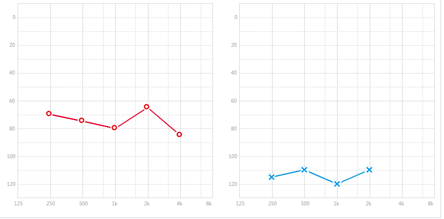 我们的验配师给老人重新做了一个听力检查。左耳为重度听损,右耳为极重度听力损失。