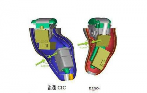 1, 内部零部件的放置空间。上图展示了普通CIC和IIC的内部结构,由此我们可以了解到定制机内部空间所包含的零部件主要是电池,麦克风,芯片,受话器(喇叭)和电感,另外还需要在外壳边缘留出空间制作出通气孔。这些零部件和结构都需安装在助听器内部,因此需要有足够的空间。助听器制作工程师会根据每个人的耳模形状,设计出最合理的大小和形状,在可能的情况下尽可能做到最小,最隐蔽。如果耳道比较粗,零部件可以部分并排放置,那么助听器就可以做的粗而短,位置更深;如果耳道比较细,零部件就只能纵向排列放置,那么助听器就会细而长。甚至在耳道靠近鼓膜端很细时,受话器都无法放置时,就只能往耳道口找足够粗的位置,这种情况在儿童制作CIC定制机时比较多见。