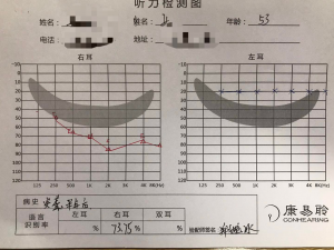 情况描述:53岁的邱女士由于在2020.05.04突发性耳聋,去石狮市医院做的,当时的情况是右耳平均听损80dB,左耳正常。第二次检查是在泉州城东分院,左耳正常听力,右耳听损阈值60dB 。第三次复查听力是在石狮医院检查,左耳正常听力,右耳听损阈值72.5dB。 第四次复查听力在泉州第一医院,右耳听损阈值73.75dB。经过多次复查治疗后,听力无法回复到正常值,并且由于听力下降后戴来耳鸣问题,对她的生活带来极大的困扰,所以邱女士便找到了我们泉州听力服务中心,来试试助听器。