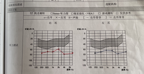 易声听力服务中心工作人员为老人做了全面的听力检查,老人听力损失属于重度听力损失。